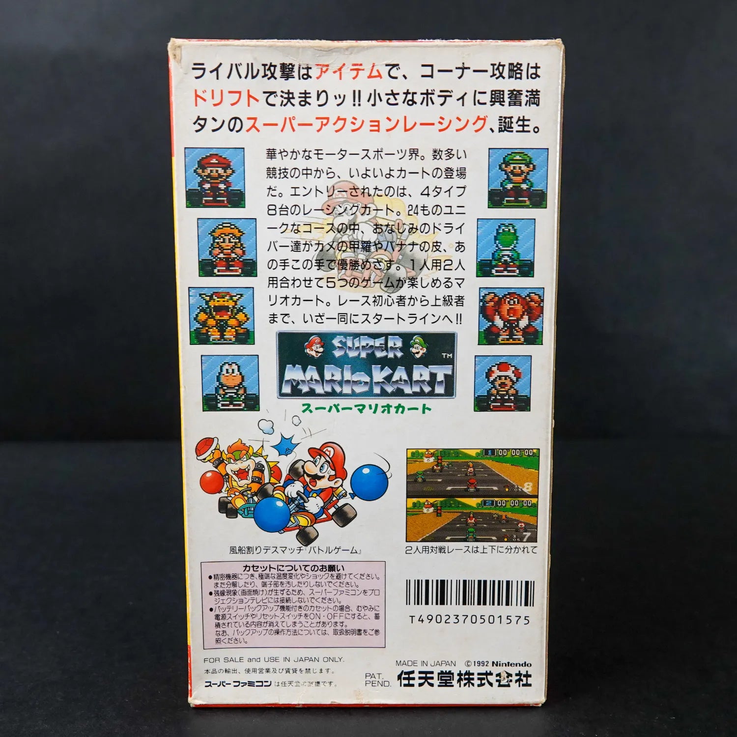 Erlebe den Mode-7-Klassiker mit Mario, Luigi, "Kinopio" (Toad) und "Koopa" (Bowser). Die japanische Box im Hochformat ist mit ihrem wunderschönen Artwork ein echtes Schmuckstück für die Vitrine. Das Spiel ist auch ohne Japanisch-Kenntnisse problemlos spielbar, da die Menüs weitgehend international verständlich sind.