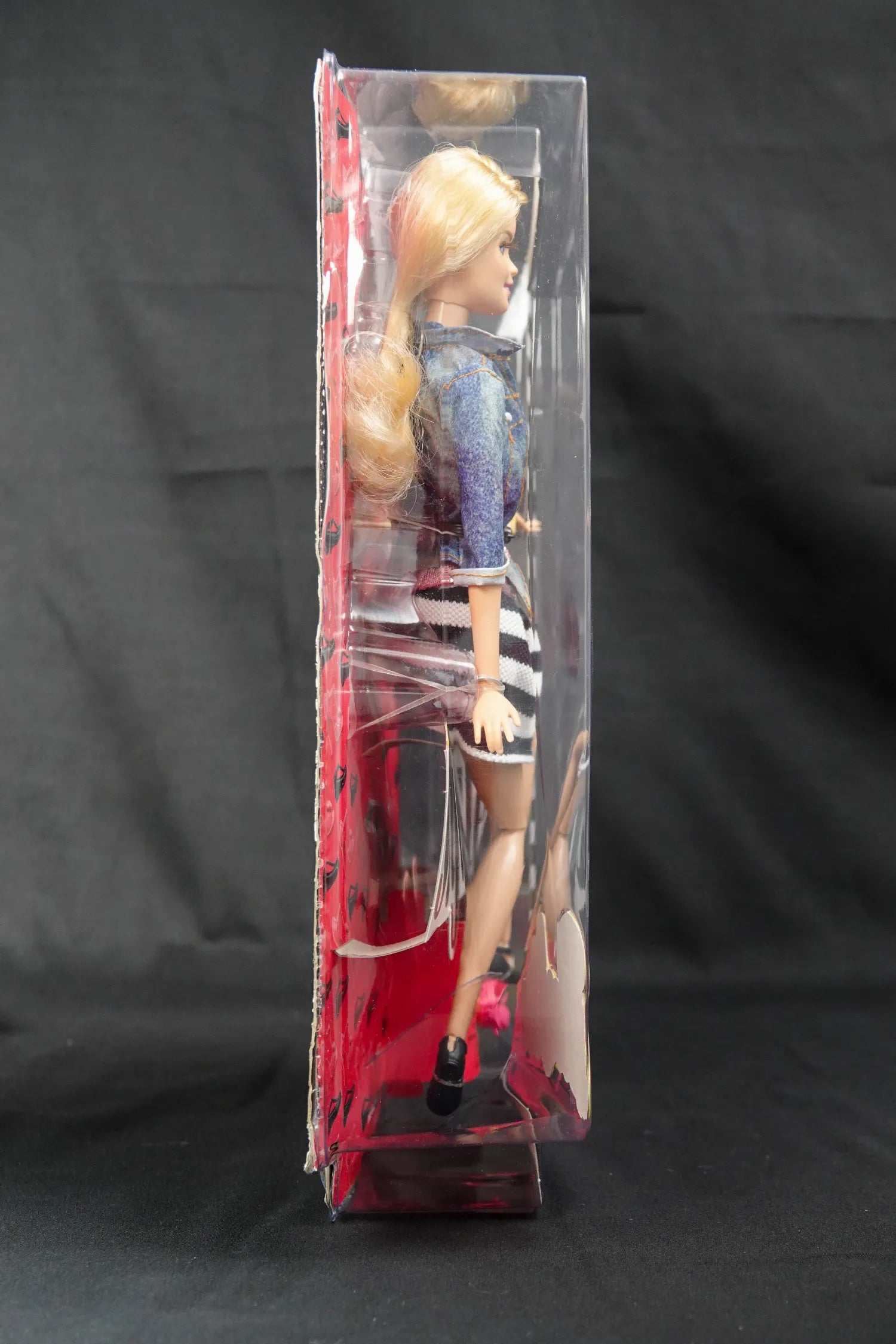 Besonders genial ist das seltene 'Flats to Heels'-Feature: Dank der beweglichen Fußgelenke kann diese Fashionista endlich bequem zwischen flachen Ballerinas und schicken High Heels wechseln – beide Varianten sind im Set enthalten! Ihr Outfit ist ein echter Hingucker: Eine hochwertig verarbeitete Jeansjacke über einem rosa Glitzertop, kombiniert mit einem grafischen schwarz-weißen Rock. Egal ob du sie auspackst (NRFB-Sammler aufgepasst: Sie ist noch versiegelt!) oder in der Box präsentierst – diese Qualität findest du heute im Laden nicht mehr.